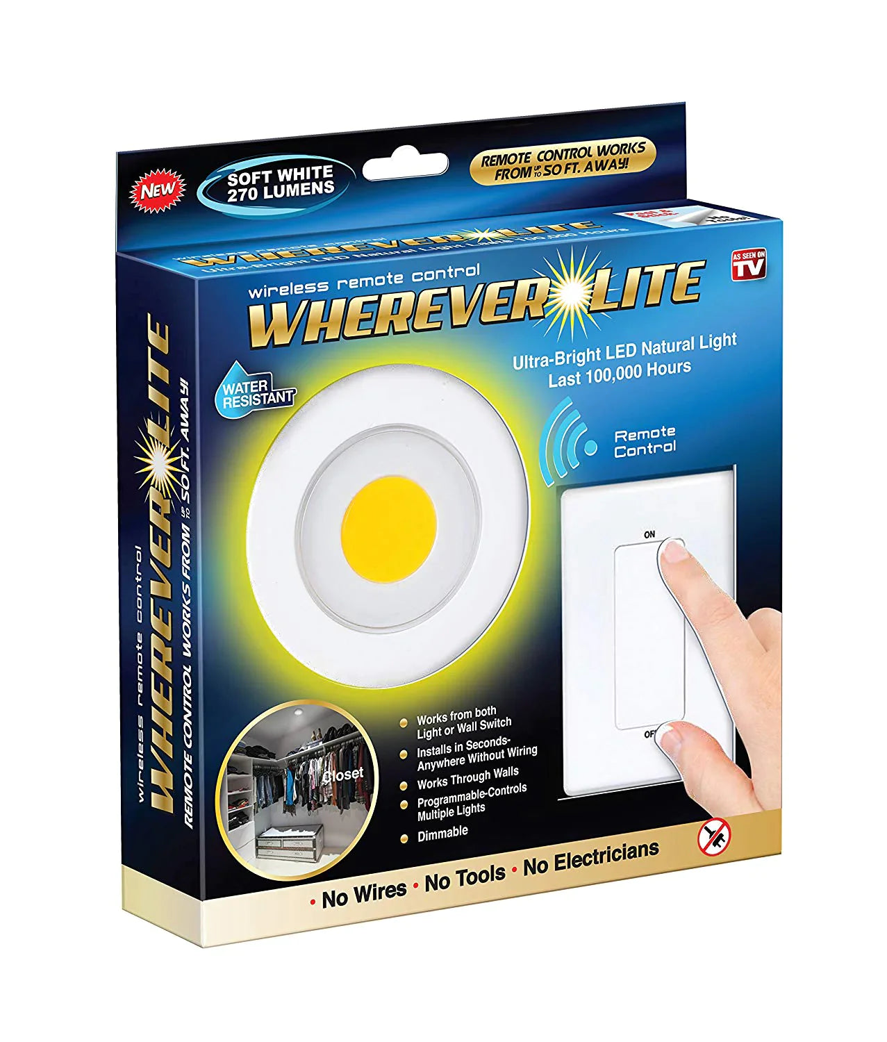The wireless, remote control Wherever Lite works up to 15 metres away from the light or wall switch. The ultra-bright LED natural light and lasts 100,000 hours.
